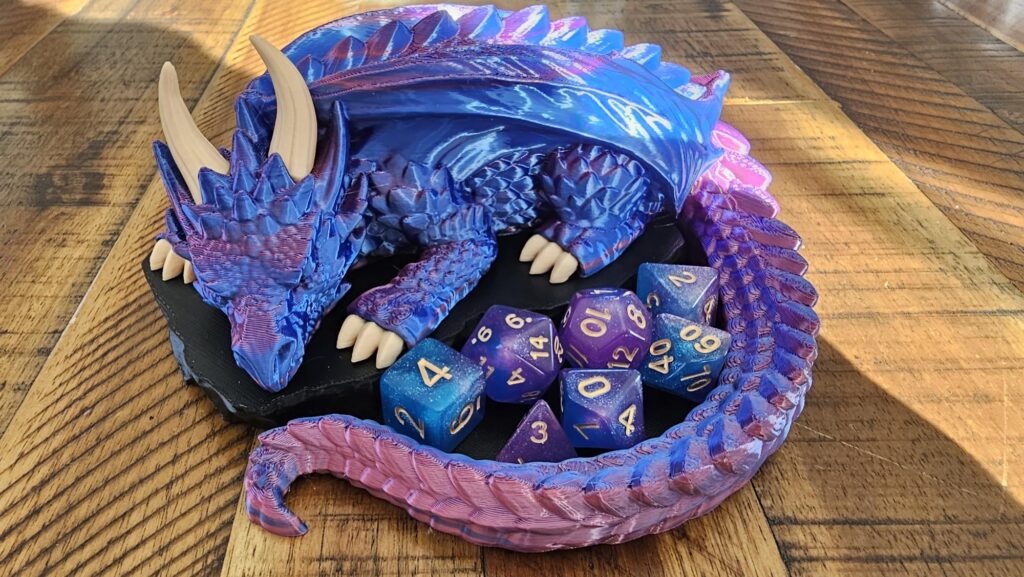 Je propose à la vente cette magnifique figurine de dragon, entièrement imprimée en 3D, conçue pour accueillir et protéger vos précieux dés de jeu de rôle. C’est l’accessoire idéal pour tout joueur de Donjons & Dragons, Pathfinder ou tout autre JdR !